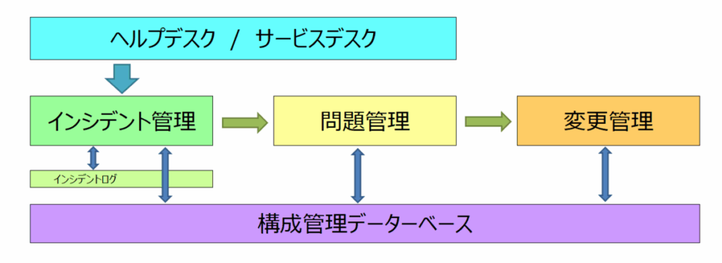 ウチの部署ではITILというITサービスマネジメントのガイドラインになんとなく則って、ヘルプデスクサービスなんかの運営も進めてまして、下図のようなフレームワークで話を進めると、割とスムースに問題に対して取り組めたりします。ITILについてはもっと詳しいサイトがいっぱいあるかと思いますので、そちらも参照ください。